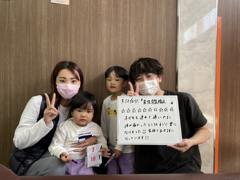 出産後の骨盤と背骨を矯正してもらう事で慢性化していた肩こりと頭痛が改善し、産後の体重やスタイルにも変化がありました!良い事ばかりの変化でとても嬉しいです♪これなら毎日の育児と家事が頑張れます。キッズスペースが設置されていたり女性のスタッフさんがいるので子どもと一緒に安心して通院できます。定期的な体のメンテナンスを継続していき健康な体で毎日の育児、家事を楽しんでいきたいと思います。